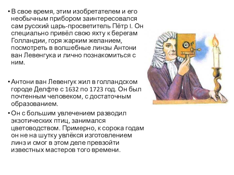 русский царь-просветитель Пётр I. Он специально привёл свою яхту к берегам Голландии, горя жарким желанием, посмотреть в волшебные линзы Антони ван Левенгука и лично познакомиться с ним.