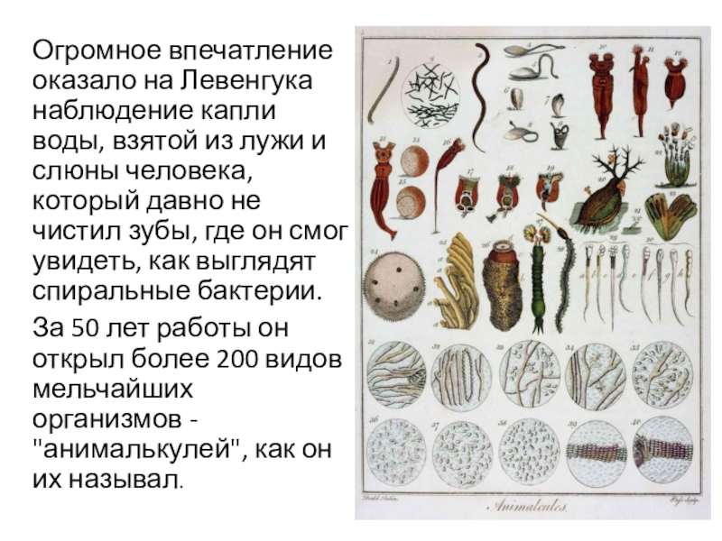 Слайд 14Огромное впечатление оказало на Левенгука наблюдение капли воды, взятой из лужи