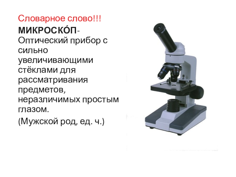 МИКРОСКО́П-Оптический прибор с сильно увеличивающими стёклами для рассматривания предметов, неразличимых