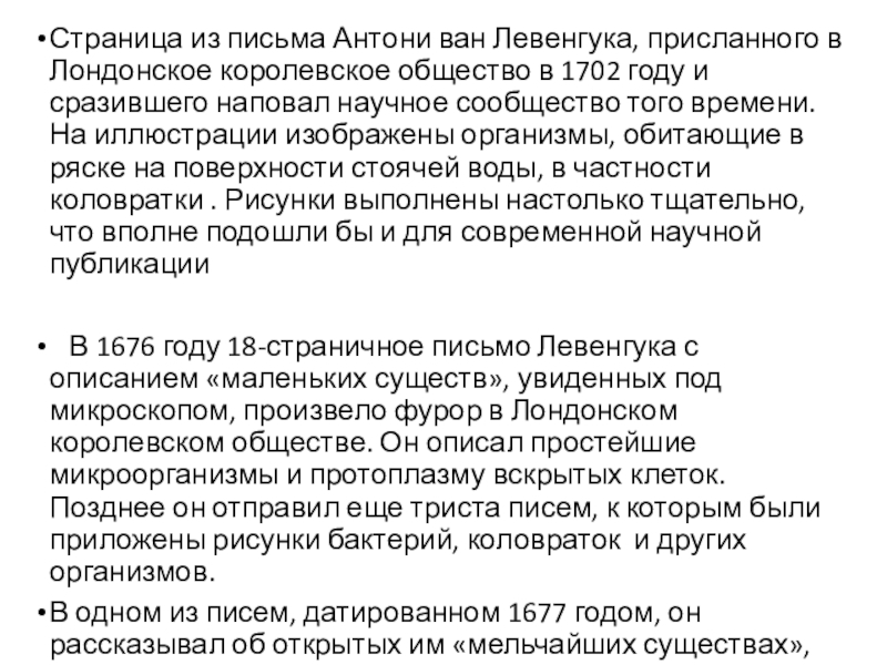 В 1676 году 18-страничное письмо Левенгука с описанием «маленьких существ», увиденных под микроскопом, произвело фурор в Лондонском королевском обществе. Он описал простейшие микроорганизмы и протоплазму вскрытых клеток. Позднее он отправил еще триста писем, к которым были приложены рисунки бактерий, коловраток и других организмов.