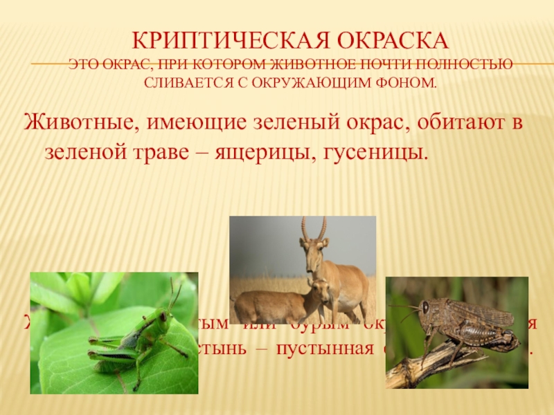 Животные с желтым или бурым окрасом являются обитателями пустынь – пустынная саранча, сайгак.