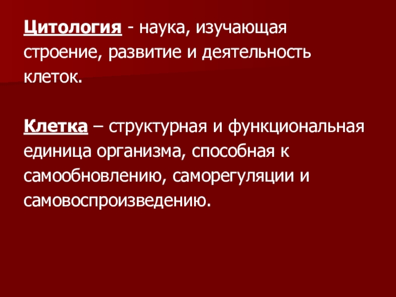Цитология - наука, изучающаястроение, развитие и деятельностьклеток.Клетка – структурная и функциональнаяединица организма, способная ксамообновлению, саморегуляции исамовоспроизведению.