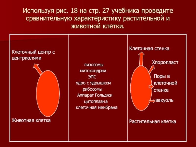 Используя рис. 18 на стр. 27 учебника проведите сравнительную характеристику растительной и животной клетки.