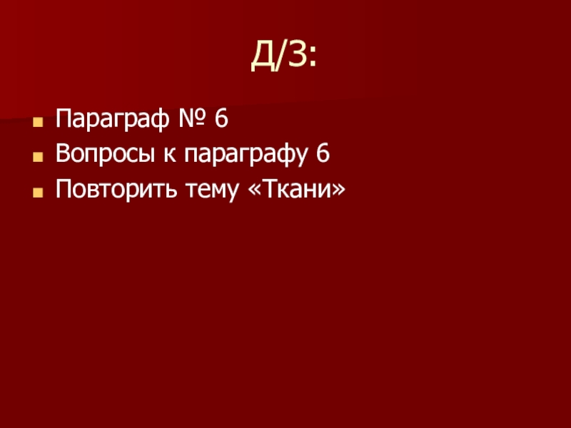 Д/З:Параграф № 6Вопросы к параграфу 6Повторить тему «Ткани»