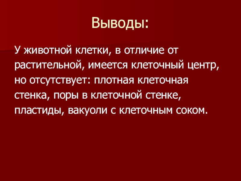 Выводы:У животной клетки, в отличие отрастительной, имеется клеточный центр,но отсутствует: плотная клеточнаястенка, поры в клеточной стенке,пластиды, вакуоли