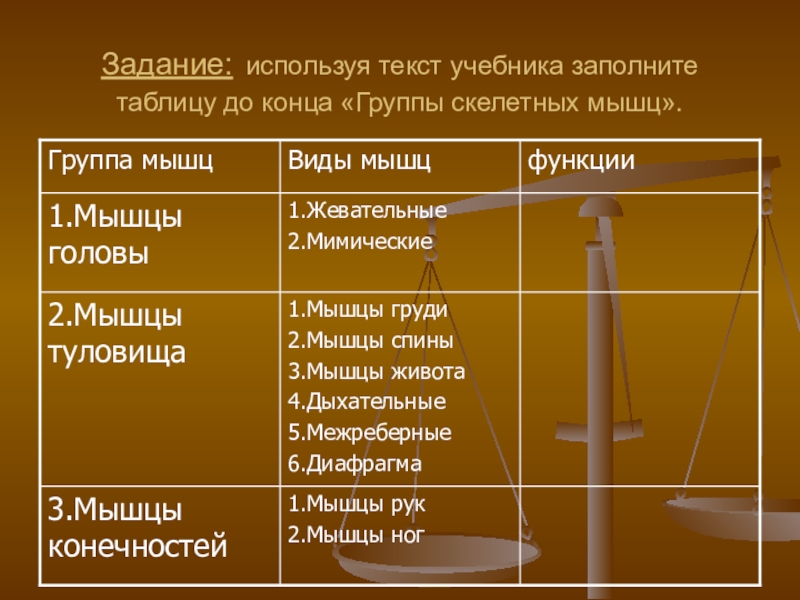 Слайд 13Задание: используя текст учебника заполните таблицу до конца «Группы скелетных мышц».