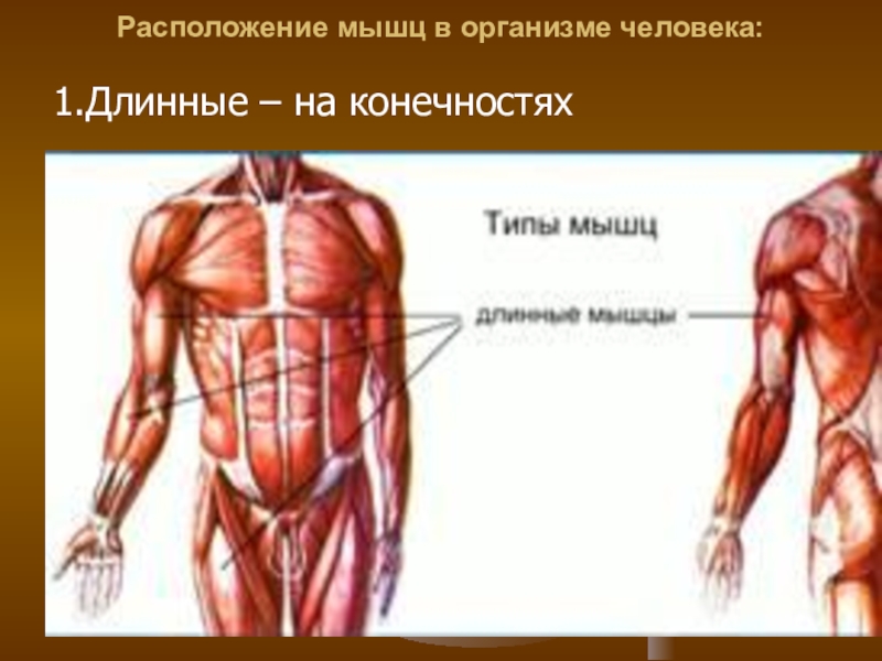 Расположение мышц в организме человека:1.Длинные – на конечностях