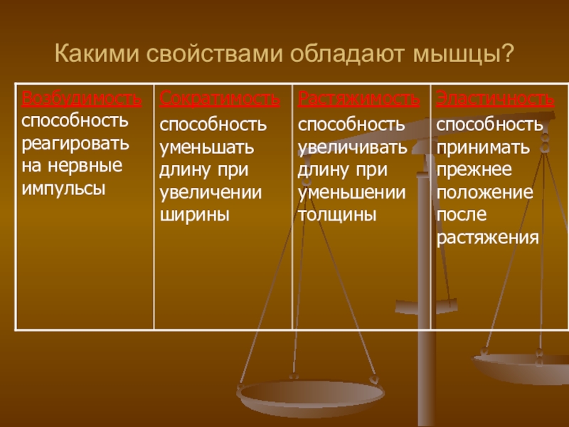 Слайд 7Сравнение свойств гладких и поперечно-полосатых мышц.