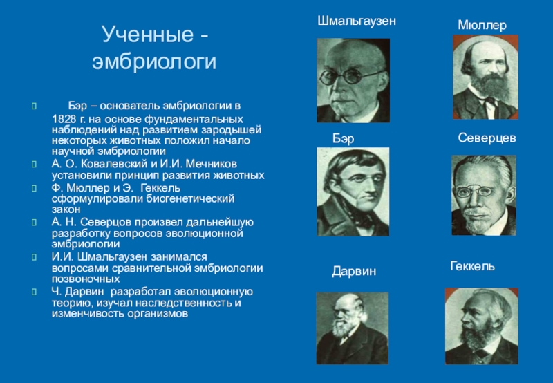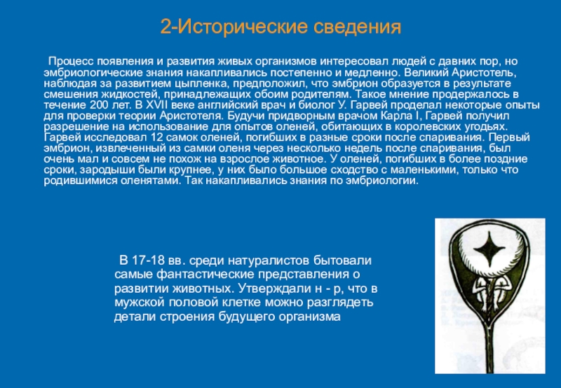 Процесс появления и развития живых организмов интересовал людей с давних пор, но эмбриологические знания накапливались постепенно и медленно. Великий Аристотель, наблюдая за развитием цыпленка, предположил, что эмбрион образуется в результате смешения жидкостей, принадлежащих обоим родителям. Такое мнение продержалось в течение 200 лет. В XVII веке английский врач и биолог У. Гарвей проделал некоторые опыты для проверки теории Аристотеля. Будучи придворным врачом Карла I, Гарвей получил разрешение на использование для опытов оленей, обитающих в королевских угодьях. Гарвей исследовал 12 самок оленей, погибших в разные сроки после спаривания. Первый эмбрион, извлеченный из самки оленя через несколько недель после спаривания, был очень мал и совсем не похож на взрослое животное. У оленей, погибших в более поздние сроки, зародыши были крупнее, у них было большое сходство с маленькими, только что родившимися оленятами. Так накапливались знания по эмбриологии.