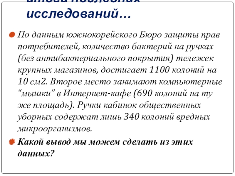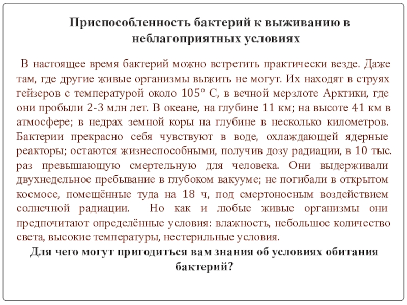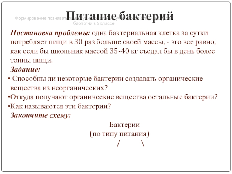 Постановка проблемы: одна бактериальная клетка за сутки потребляет пищи в 30 раз больше своей массы, - это все равно, как если бы школьник массой 35-40 кг съедал бы в день более тонны пищи.