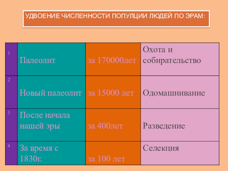 Слайд 12УДВОЕНИЕ ЧИСЛЕННОСТИ ПОПУЛЦИИ ЛЮДЕЙ ПО ЭРАМ: