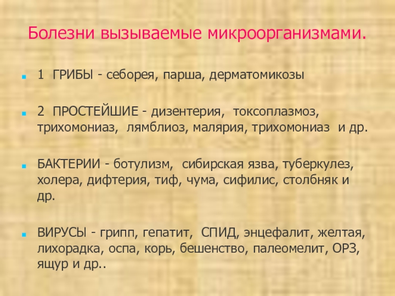 БАКТЕРИИ - ботулизм, сибирская язва, туберкулез, холера, дифтерия, тиф, чума, сифилис, столбняк и др.