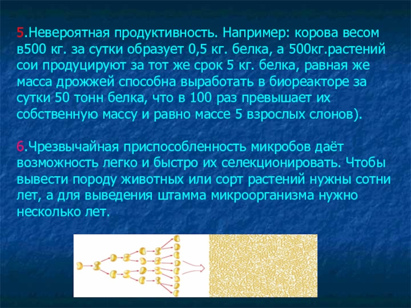 6.Чрезвычайная приспособленность микробов даёт возможность легко и быстро их селекционировать. Чтобы вывести породу животных или сорт растений нужны сотни лет, а для выведения штамма микроорганизма нужно несколько лет.