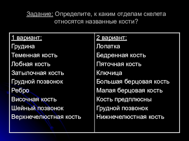 Слайд 11Задание: Определите, к каким отделам скелета относятся названные кости?