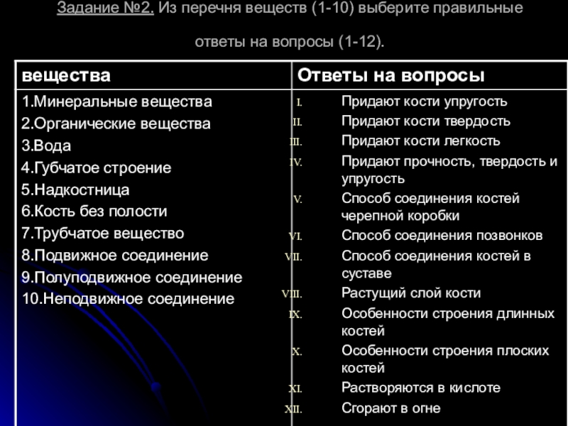 Слайд 3Задание №2. Из перечня веществ (1-10) выберите правильные ответы на вопросы