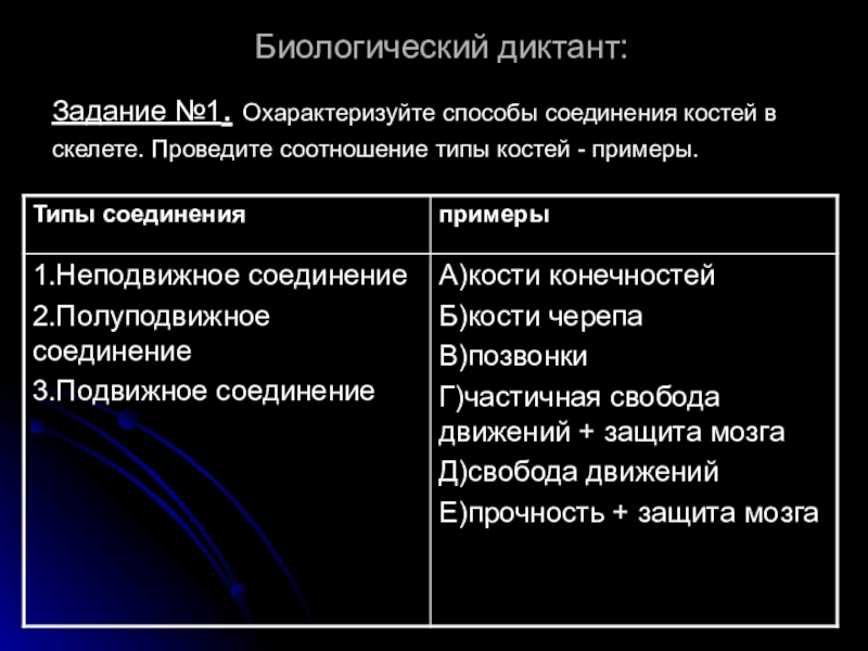 Биологический диктант:Задание №1. Охарактеризуйте способы соединения костей вскелете. Проведите соотношение типы костей - примеры.