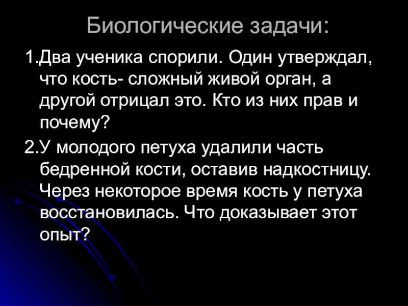 Биологические задачи:1.Два ученика спорили. Один утверждал, что кость- сложный живой орган, а другой отрицал это. Кто из