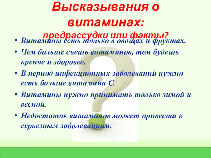 Слайд 15Высказывания о витаминах: предрассудки или факты?