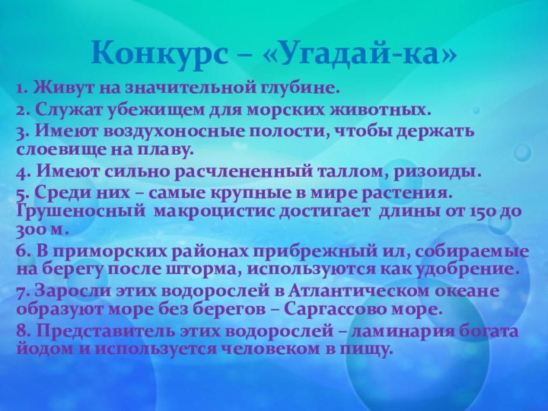 7. Заросли этих водорослей в Атлантическом океане образуют море без берегов – Саргассово море.
