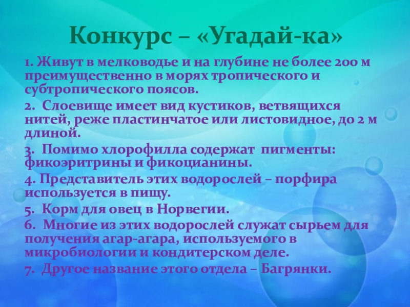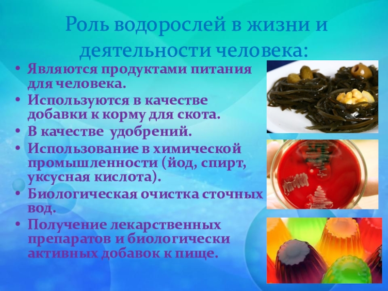 6. Многие из этих водорослей служат сырьем для получения агар-агара, используемого в микробиологии и кондитерском деле.