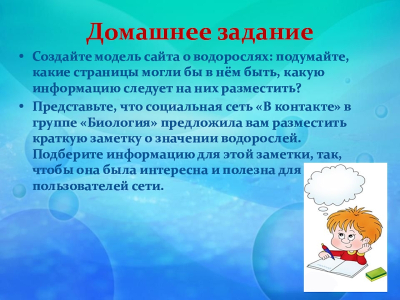 Представьте, что социальная сеть «В контакте» в группе «Биология» предложила вам разместить краткую заметку о значении водорослей. Подберите информацию для этой заметки, так, чтобы она была интересна и полезна для пользователей сети.