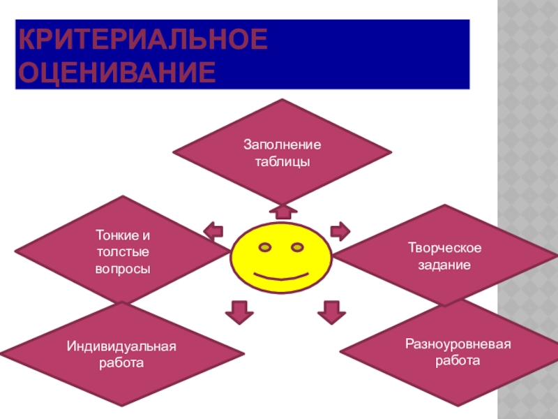 Критериальное оцениваниеЗаполнение таблицыТонкие и толстые вопросыИндивидуальная работаРазноуровневая работаТворческое задание