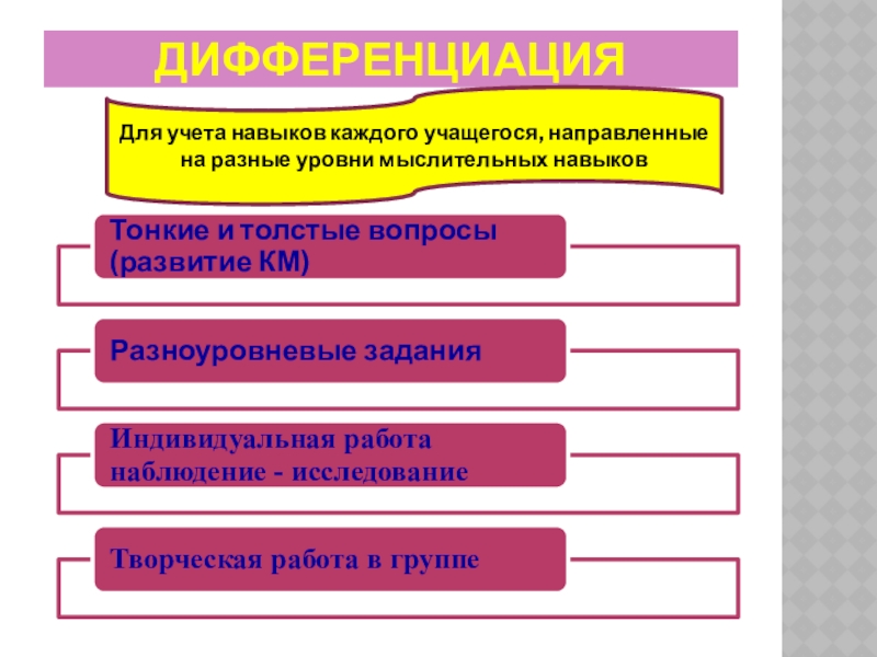 ДифференциацияДля учета навыков каждого учащегося, направленные на разные уровни мыслительных навыков