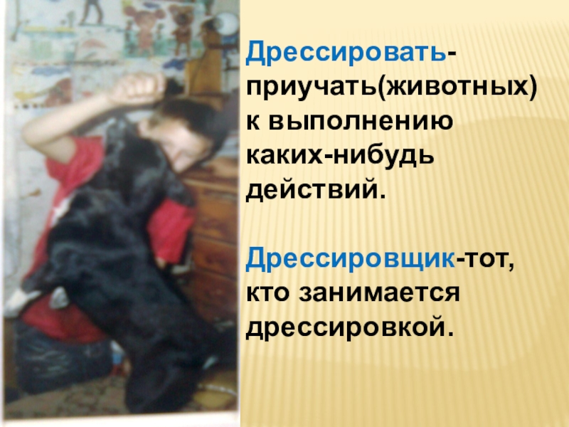 Слайд 10Дрессировать-приучать(животных) к выполнению каких-нибудь действий.