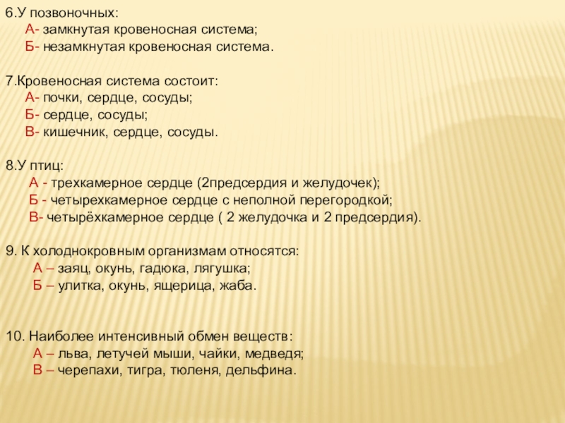 6.У позвоночных:     А- замкнутая кровеносная система;   Б- незамкнутая кровеносная система. 7.Кровеносная