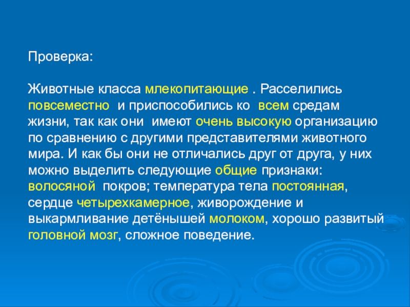………… средам жизни, так как они имеют …………….. организацию по сравнению с другими представителями животного мира. И как бы они не отличались друг от друга, у них можно выделить следующие …………………признаки: ………… покров; температура тела ……………. , сердце………………, живорождение и выкармливание детёнышей…………….., хорошо развитый …………………………., сложное поведение.