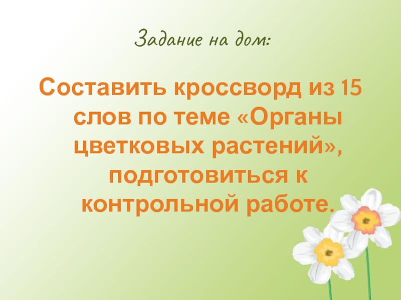 Задание на дом:Составить кроссворд из 15 слов по теме «Органы цветковых растений», подготовиться к контрольной работе.