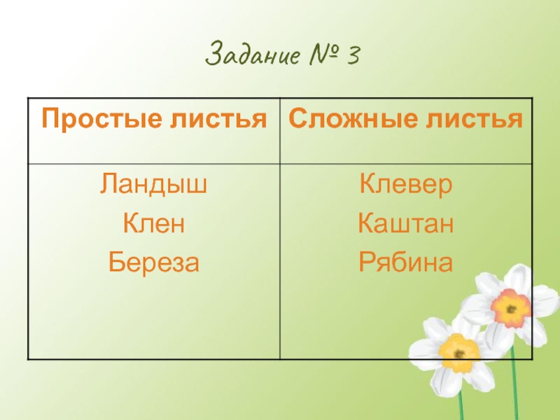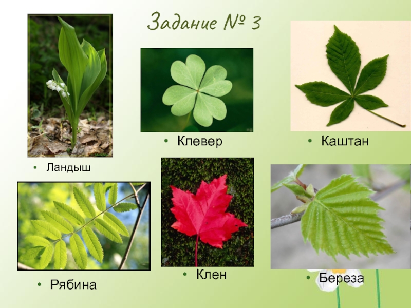 Задание № 3ЛандышКленРябинаКлеверКаштанБереза