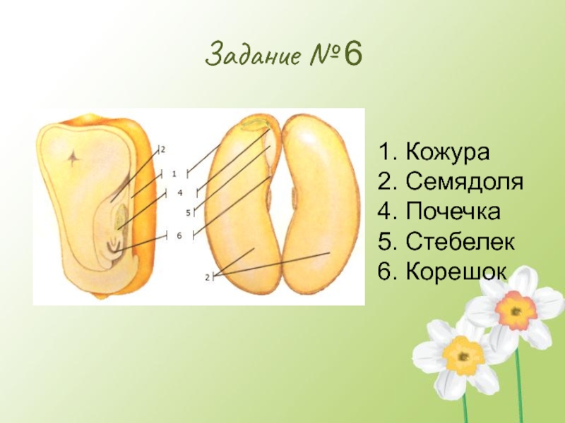 Задание № 61. Кожура2. Семядоля4. Почечка5. Стебелек6. Корешок