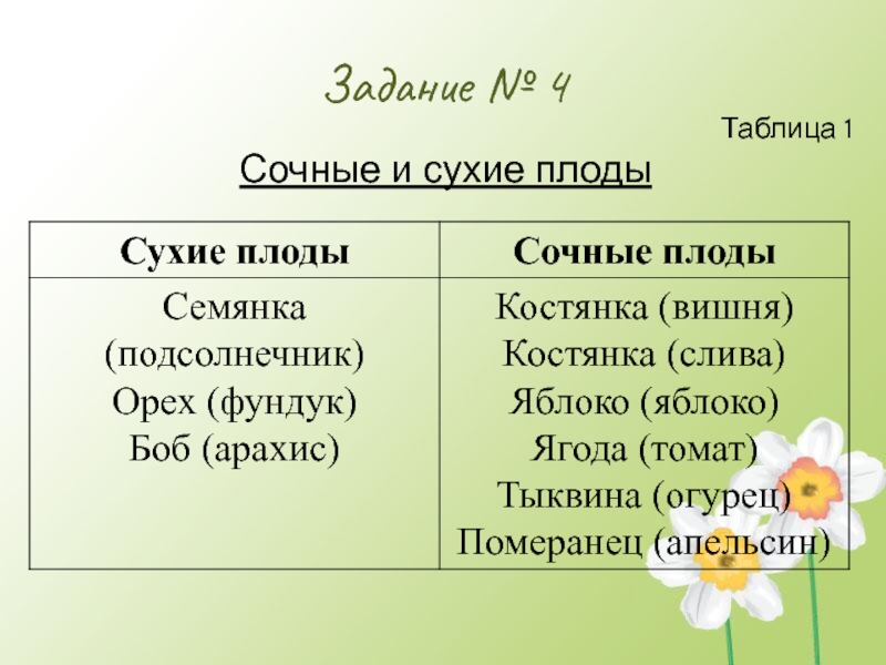 Задание № 4Таблица 1Сочные и сухие плоды