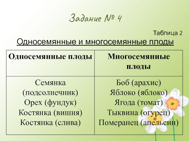 Задание № 4Таблица 2Односемянные и многосемянные плоды
