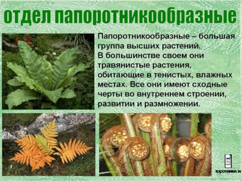 К группе папоротникообразных относят три отдела растений: папоротники, хвощи и плауны.Папоротники, хвощи и плауны – одни из