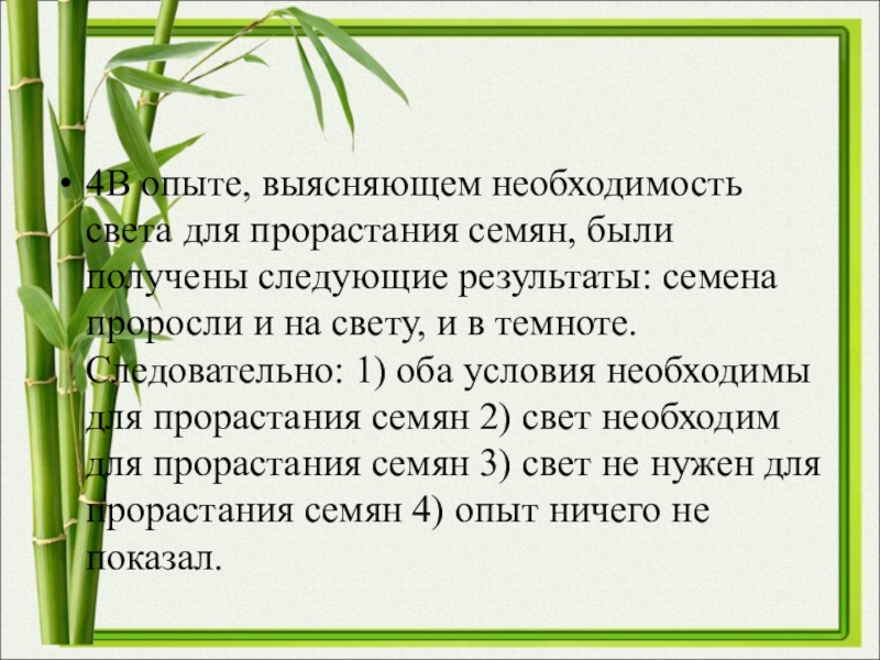 результаты: семена проросли и на свету, и в темноте. Следовательно: 1) оба условия необходимы для прорастания семян 2) свет необходим для прорастания семян 3) свет не нужен для прорастания семян 4) опыт ничего не показал.
