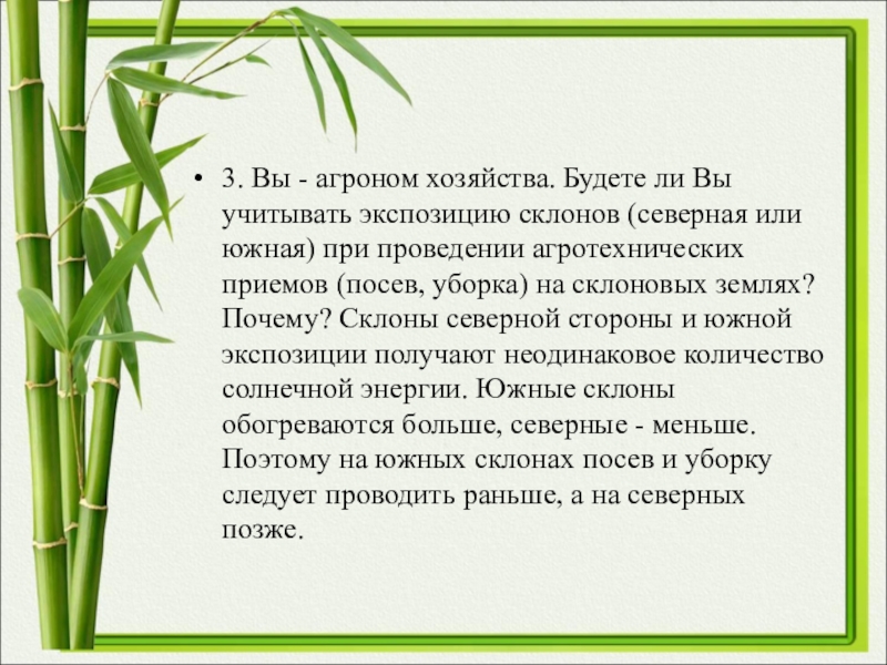3. Вы - агроном хозяйства. Будете ли Вы учитывать экспозицию склонов