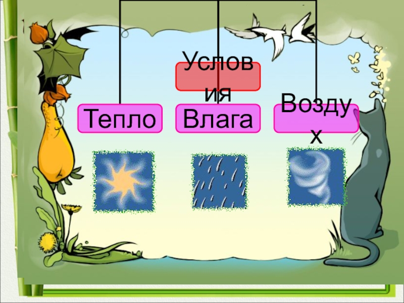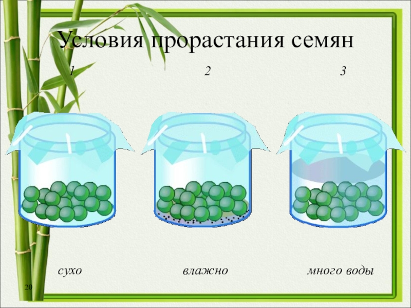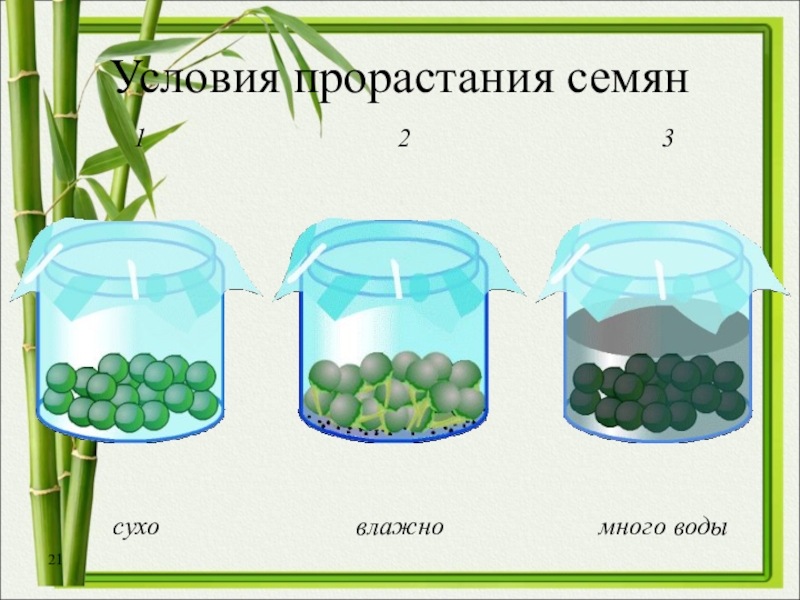 питательные вещества, целый зародыш, вода, тепло и воздух 3) почва 4) свет.