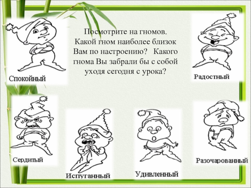 Слайд 48Посмотрите на гномов. Какой гном наиболее близок Вам по настроению?