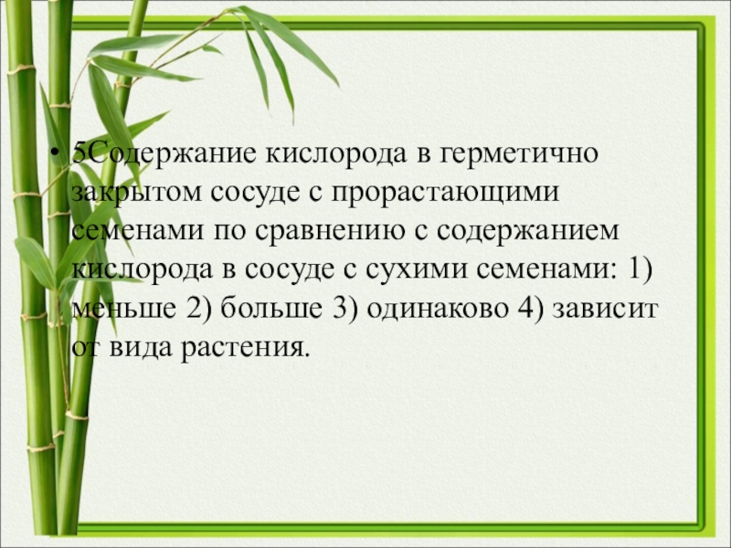 с содержанием кислорода в сосуде с сухими семенами: 1) меньше 2) больше 3) одинаково 4) зависит от вида растения.