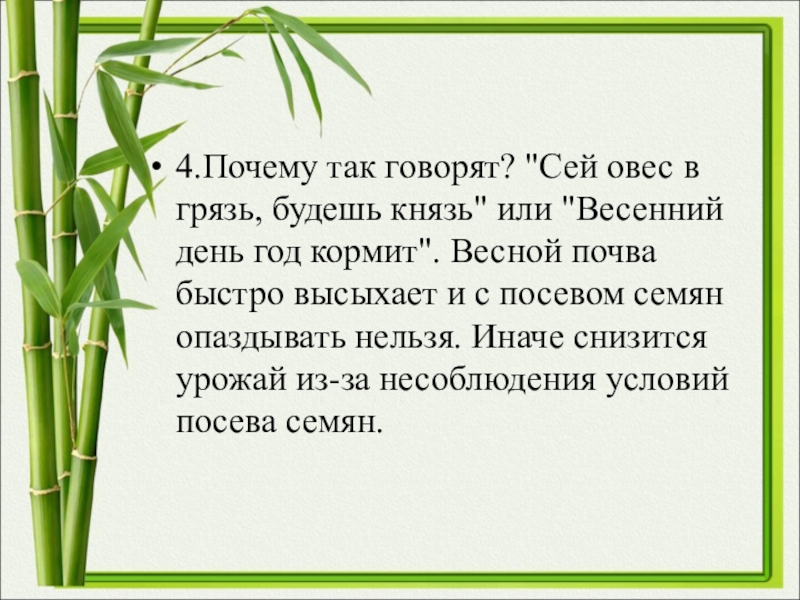 4.Почему так говорят? "Сей овес в грязь, будешь князь" или "Весенний