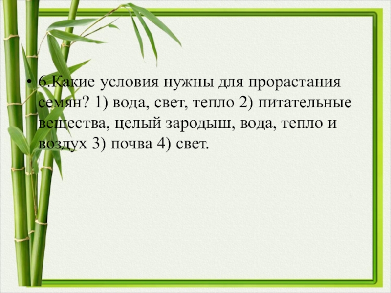 6.Какие условия нужны для прорастания семян? 1) вода, свет, тепло 2)