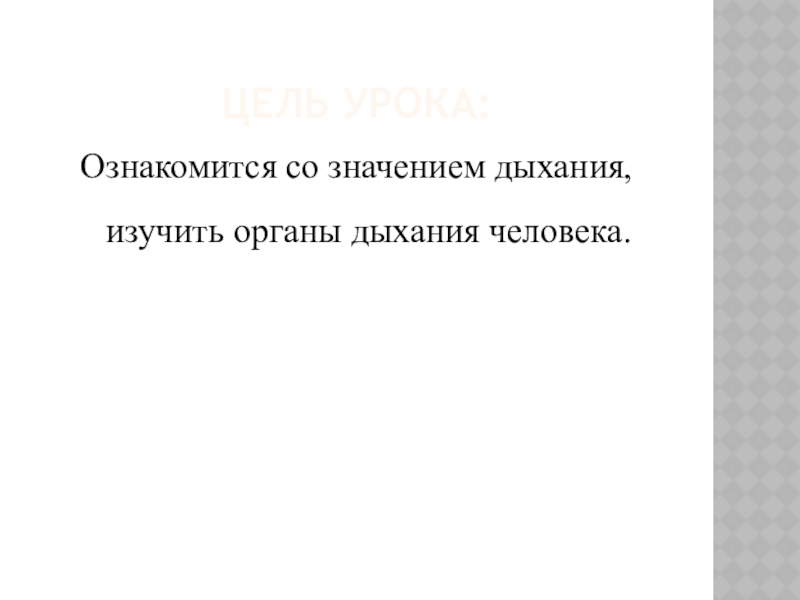 Цель урока:Ознакомится со значением дыхания, изучить органы дыхания человека.