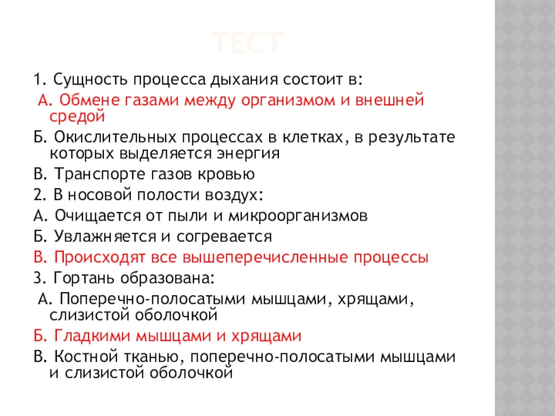 Тест1. Сущность процесса дыхания состоит в: A. Обмене газами между организмом и внешней средой Б. Окислительных процессах