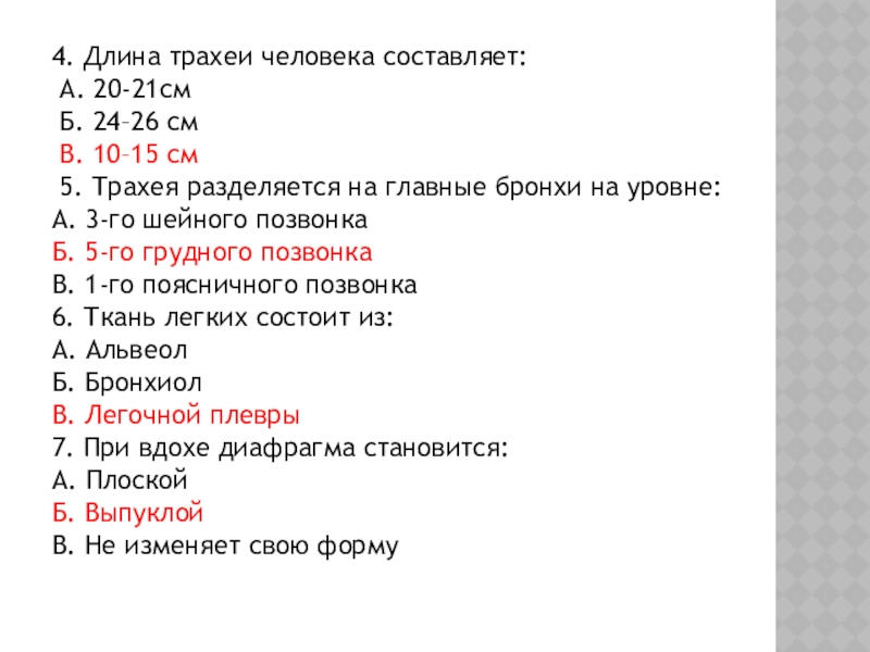 4. Длина трахеи человека составляет: А. 20-21см Б. 24–26 см В. 10–15 см 5. Трахея разделяется на