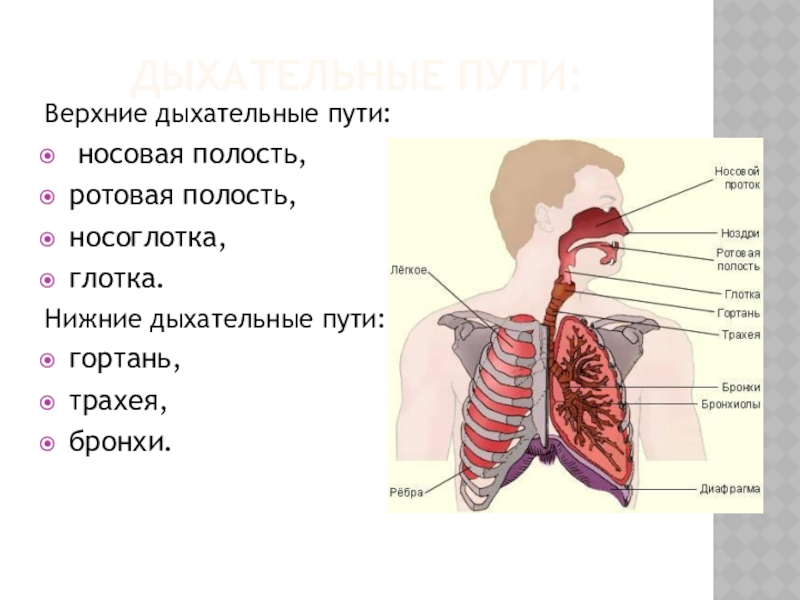 Дыхательные пути:Верхние дыхательные пути: носовая полость, ротовая полость, носоглотка, глотка. Нижние дыхательные пути:гортань, трахея, бронхи.