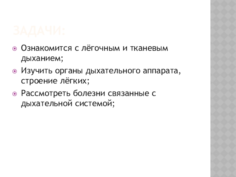 Задачи:Ознакомится с лёгочным и тканевым дыханием;Изучить органы дыхательного аппарата, строение лёгких;Рассмотреть болезни связанные с дыхательной системой;