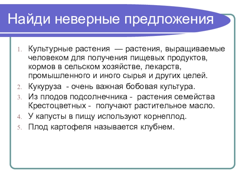 Найди неверные предложенияКультурные растения — растения, выращиваемые человеком для получения пищевых продуктов, кормов в сельском хозяйстве, лекарств,