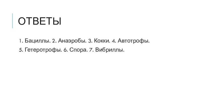 ответы1. Бациллы. 2. Анаэробы. 3. Кокки. 4. Автотрофы. 5. Гетеротрофы. 6. Спора. 7. Вибриллы.